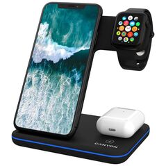 Φορτιστής Canyon CANYON WS-302, Ασύρματος φορτιστής 3 σε 1, με κουμπί αφής για φως τρεχούμενου νερού, Είσοδος 9V/2A,12V/1.5A Έξοδος 15W/10W/7.5W/5W, Καλώδιο Type c σε USB-A μήκους 1.2m, με QC18W EU βύσμα 137*103*140mm, 0.22Kg, Μαύρο