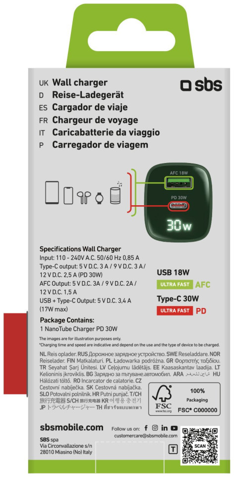 Φορτιστής Τοίχου SBS LCD USB-A USB-C LCD 30 W zala - Ladetajs