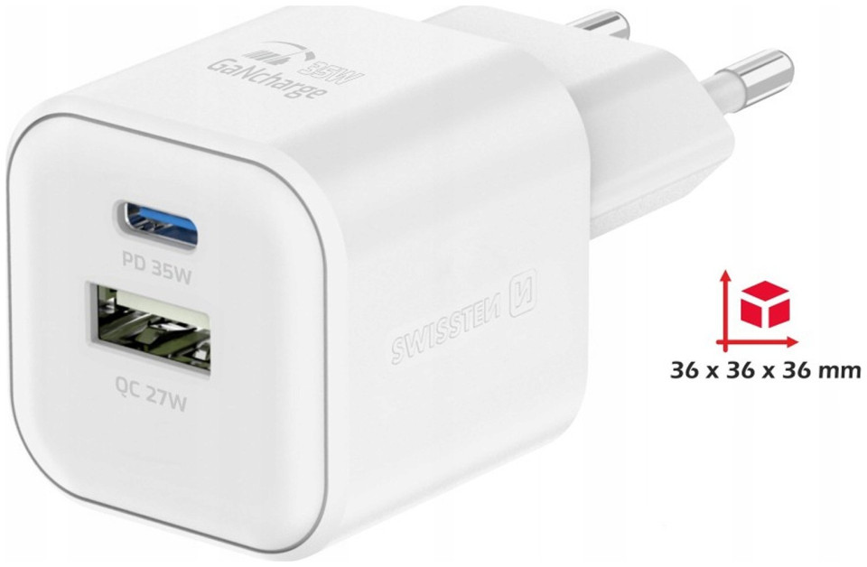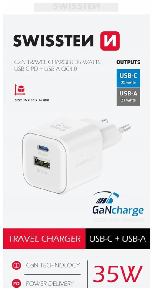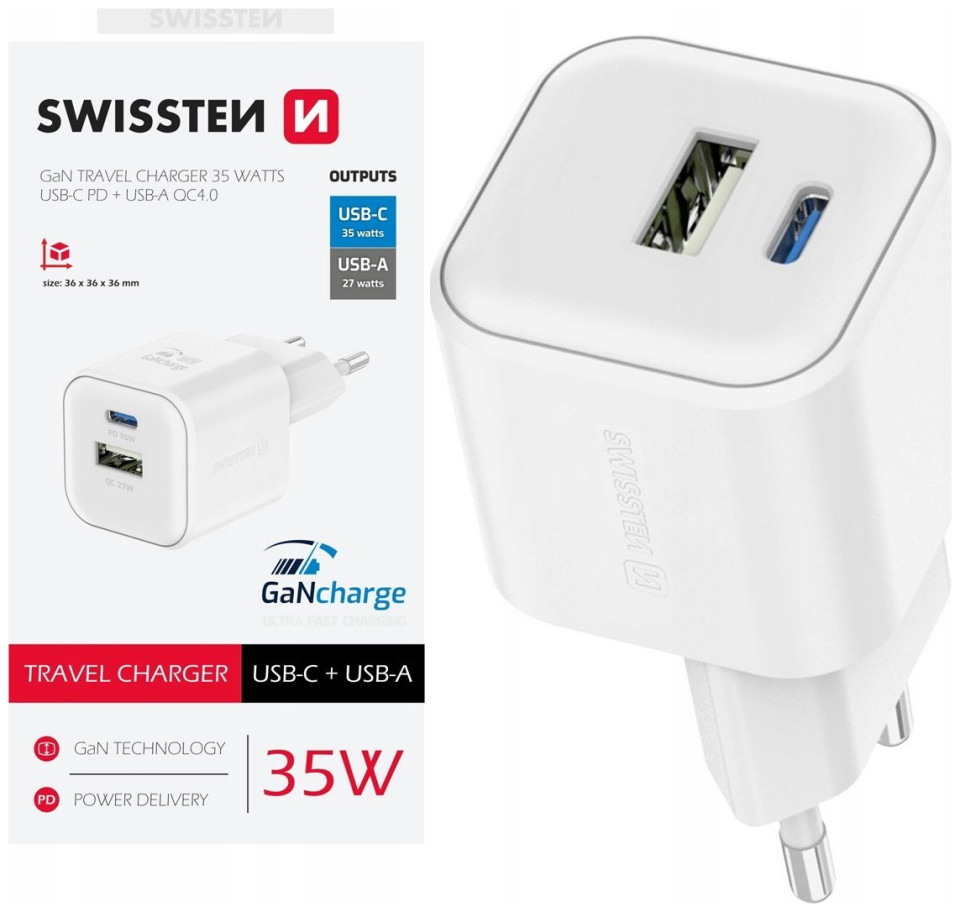 Προσαρμογέας δικτύου Swissten GaN 35W, 2 θύρες, USB-A + USB-C, Smart IC