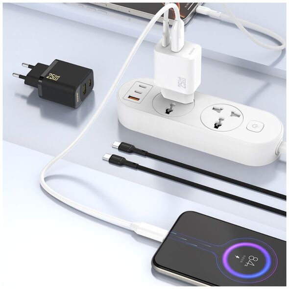 Ładowarka Dudao A26T 25W to nowoczesne i wydajne rozwiązanie dla osób ceniących szybkie i bezpieczne ładowanie. Wyposażona w technologię GaN, oferuje wysoką moc 25W przy kompaktowych rozmiarach. Obsługuje standardy Power Delivery (PD) oraz Quick Charge (QC), co umożliwia ekspresowe ładowanie szerokiej gamy urządzeń. Posiada dwa porty: USB-C oraz USB-A, dzięki czemu można ładować dwa urządzenia jednocześnie. Antypoślizgowa faktura i solidna konstrukcja zapewniają bezpieczeństwo i wygodę użytkowania.