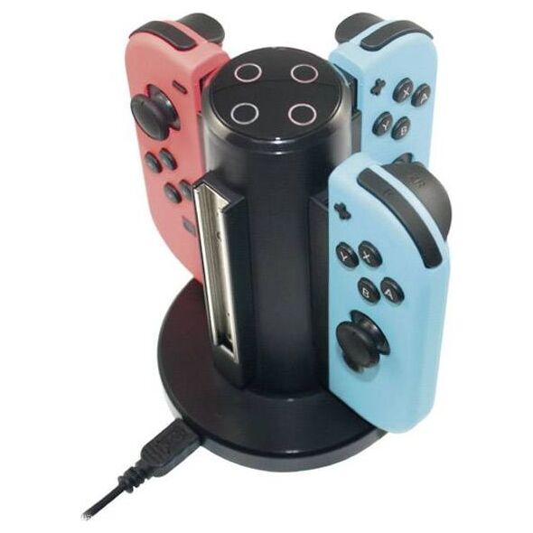 Dzięki tej ładowarce możesz ładować 4 kontrolery Nintendo Switch jednocześnie! Zestaw nie zawiera widocznego na zdjęciu poglądowym kontrolerów Joy-Con.