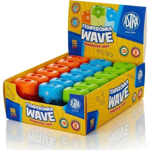 Temperówka Astra Wave o ergonomicznym kształcie z dwoma różnej wielkości otworami oraz dużą pojemością zbiornika, łatwe otwieranie. Opakowanie zbiorcze zawiera 18 sztuk.