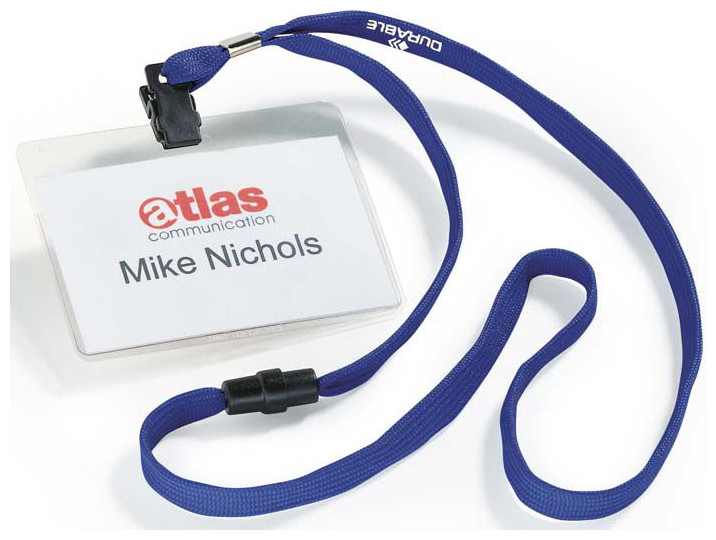 Αναγνωριστικό από διαφανές σκληρό φύλλο, Κρεμασμένο σε υφασμάτινη ταινία πλάτους 10 mm. η ταινία είναι εξοπλισμένη με ένα κούμπωμα που ανοίγει τραβώντας δυνατά. το σήμα είναι ανοιχτό στο επάνω μέρος, γεγονός που εγγυάται γρήγορη αφαίρεση της ετικέτας μέσα σε αυτό, χωρίς να ξεκουμπώσετε την ταινία. με εκτυπώσιμες ετικέτες?Αναγνωριστικά {Type}