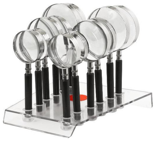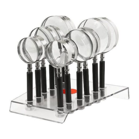 Zestaw zawiera: ? 4 szt. lupa, średnica soczewki 50 mm, powiększenie 5D ? 4 szt. lupa, średnica soczewki 65 mm, powiększenie 5D ? 4 szt. lupa, średnica soczewki 75 mm, powiększenie 3D ? 1 szt. podstawka Waga zestawu: 1000 g