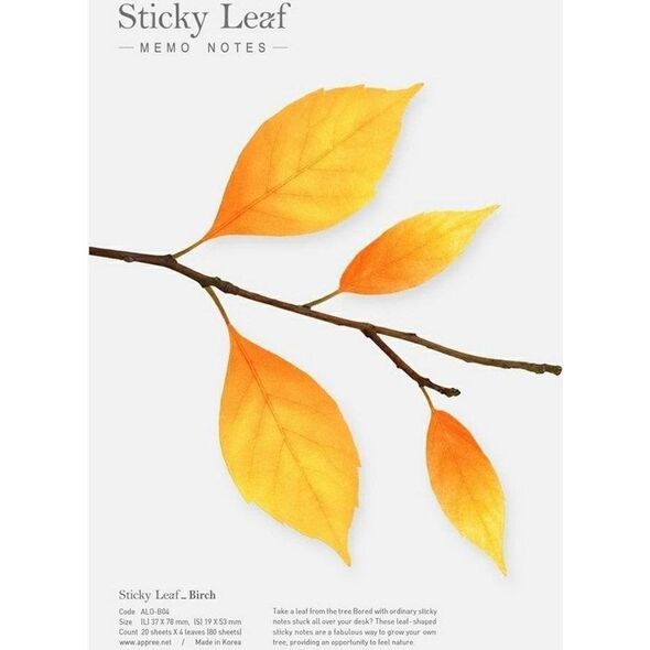 Αυτοκόλλητες σημειώσεις ευρετηρίου σε σχήμα φύλλων σημύδας. Κάθε φύλλο χαρτιού είναι αυτοκόλλητο, επομένως μπορεί να χρησιμοποιηθεί ως κλασική κάρτα σημειώσεων και ως σελιδοδείκτης ευρετηρίου. Μπορείτε να τα χρησιμοποιήσετε στο σπίτι, στο γραφείο, σε προγραμματιστές και βιβλία. Μπορούν επίσης να χρησιμοποιηθούν με φανταστικό και δημιουργικό τρόπο για το scrapbooking και το ημερολόγιο με κουκκίδες εκ φύσεως. Κάθε προϊόν είναι υψηλής ποιότητας, αισθητικής, φτιαγμένο με προσοχή στη λεπτομέρεια.Σημειώσεις {Type}