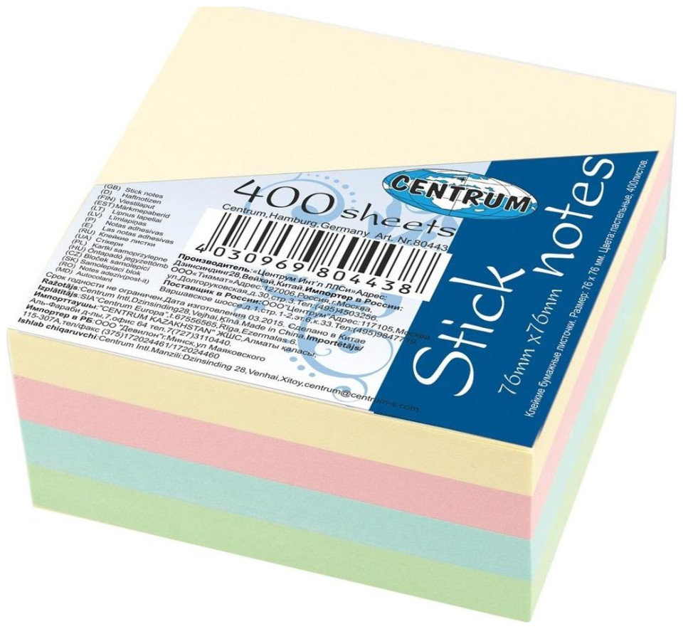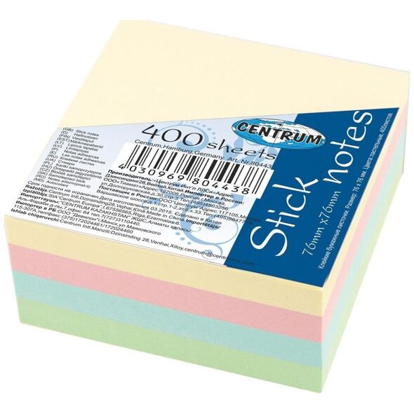 Σημειώσεις αυτοκόλλητες Centrum 76x76mm 400 φύλλα 4 παστέλ χρώματα