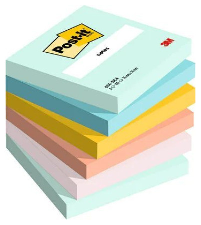 Post-It 654-6-BEA. Διάταξη: Τετράγωνο, Χρώμα προϊόντος: Μπλε, Πράσινο, Πορτοκαλί, Ροζ, Κίτρινο, Υλικά: Χαρτί. Πλάτος προϊόντος: 76 mm, Βάθος προϊόντος: 76 mm. Αριθμός φύλλων στο σημειωματάριο: 100 φύλλα Περιβαλλοντικό πιστοποιητικό (αειφόρος ανάπτυξη): PEFCΣημειώσεις {Type}