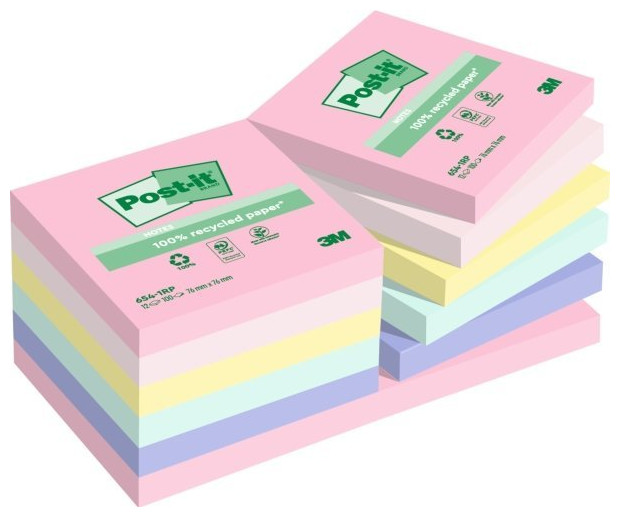 Post-it Post-it Ανακυκλωμένα Σημειωματάρια 76mmx76mm 100φύλλα/μπλοκ 12μπλοκ/πακ ανάμεικτα χρώματα