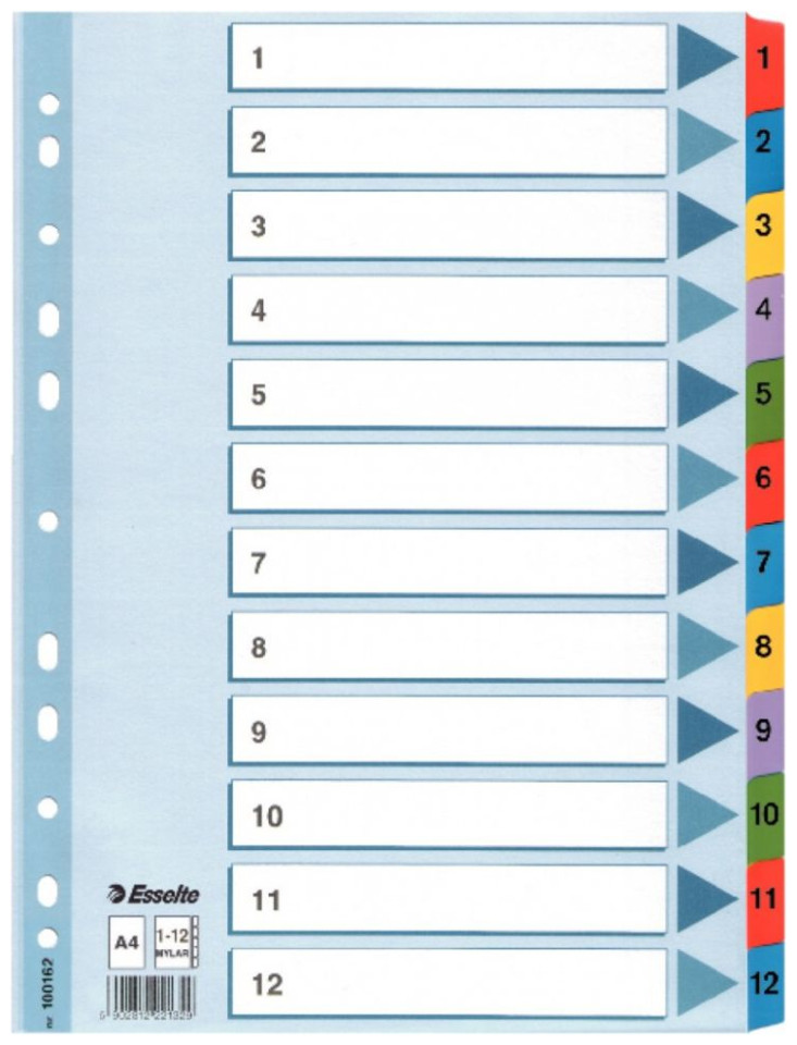 Μορφή A4, Τύπος 1-12 Έγχρωμα ευρετήρια ενισχυμένα με φύλλο MYLAR (σε 5 χρώματα) Από χοντρό, λευκό χαρτόνι 160 gsm με μεμβράνη πολλαπλών διάτρητων - ταιριάζει σε κάθε συνδετικό υλικό.{Format} A4
