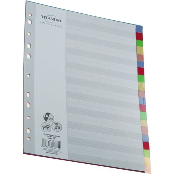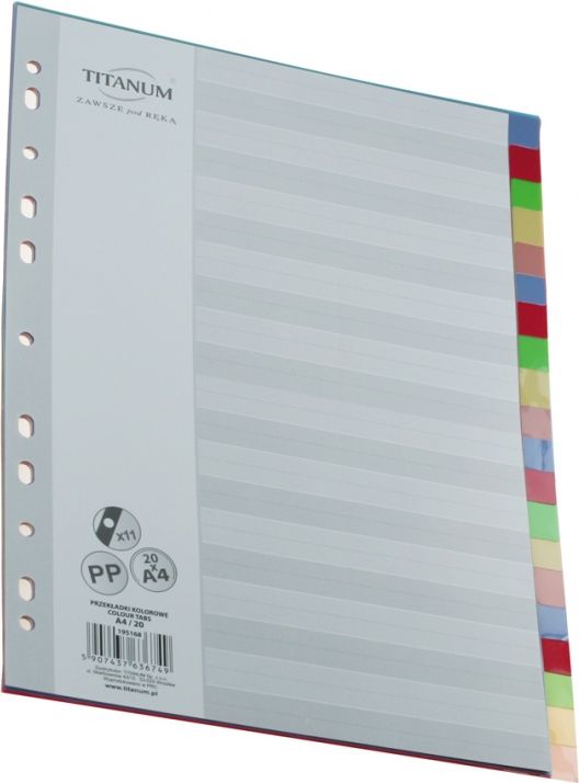 Χρωματιστά διαχωριστικά από ανθεκτικό και εύκαμπτο πολυπροπυλένιο. Η γενική διάτρηση σάς επιτρέπει να χρησιμοποιείτε το διαχωριστικό σε οποιοδήποτε συνδετικό υλικό. Η πρώτη πλευρά είναι κατασκευασμένη από χαρτόνι, που επιτρέπει τις κατάλληλες περιγραφές. Πολύ βολικό στη χρήση.{Format} A4