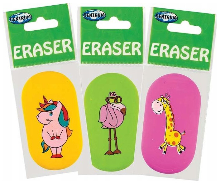 Καταπληκτικές γόμες για παιδιά που σίγουρα θα σας κάνουν να χαμογελάσετε όταν ανοίξετε τη μολυβοθήκη :). Γόμα: κατασκευαστής: CENTRUM, οβάλ σχήμα, με πολύχρωμη εκτύπωση, μοτίβο: ζώο, μέγεθος: 63 x 24 x 12 mm, σετ: 3 γόμες.