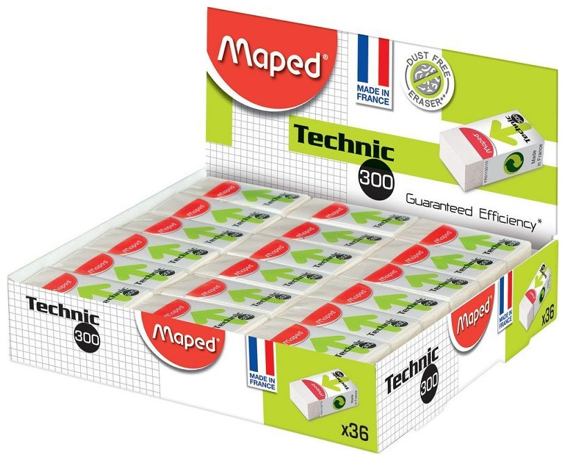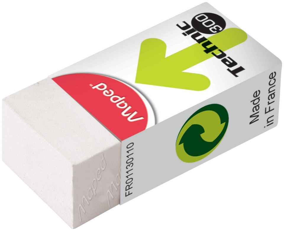 Maped M011301. Materiały: Guma, Kolor produktu: Biały, Grupa docelowa: Dla dorosłych i dzieci. Długość produktu: 39 mm, Szerokość produktu: 18 mm, Głębokość produktu: 12 mm. Kraj pochodzenia: Francja. Ilość na paczkę: 36 szt.