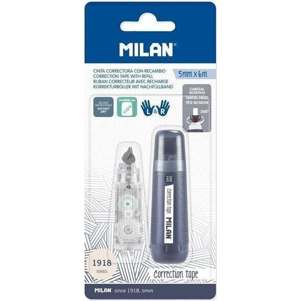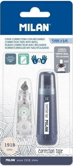 Κυλινδρική διορθωτική ταινία από τη σειρά 1918, μπλε ναυτικό. Κατάλληλο για αριστερόχειρες χάρη στην περιστροφή 360 μοιρών της άκρης. Γρήγορο, καθαρό και ακριβές. Διορθώσεις σε όλους τους τύπους χαρτιού, δεν αφήνει ίχνη σε φωτοτυπίες ή φαξ. 5mm πλάτος x 6m μήκος. Περιλαμβάνεται ένθετο ταινίας. Η σειρά 1918 είναι εμπνευσμένη από τα αυθεντικά χρώματα και το σχέδιο των λάστιχων MILAN.{Αριθμός τεμαχίων στη συσκευασία} 1