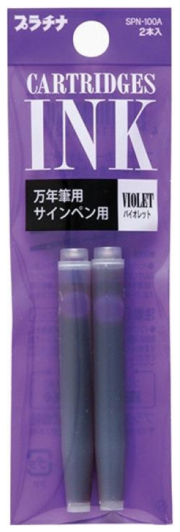 Naboje atramentowe Japońskiej marki PLATINUM. Naboje atramentowe dedykowane są do piór wiecznych Platinum i Nakaya. Posiadają one specjalną stalową kuleczkę, której zadaniem jest mieszanie atramentu. Opakowanie zawiera dwie sztuki naboju o pojemności 1,2 ml. Wyprodukowano w Japonii. Kolor fioletowy. EAN: 4977114940217