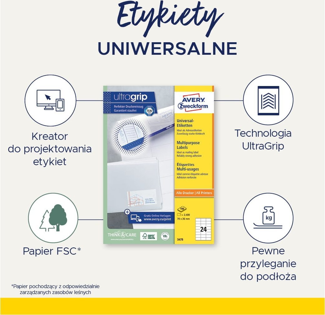 AVERY Καθολικές ετικέτες Avery 38x21,2 mm, λευκό με Ultragrip + 30% επιπλέον περιεχόμενο - (65 φύλλα x 65 τεμ.)