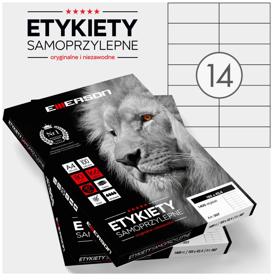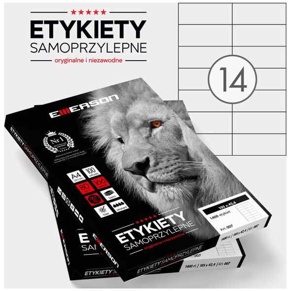 * Οι λευκές αυτοκόλλητες ετικέτες παραδίδονται σε φύλλα Α4 * λειτουργούν με όλους τους τύπους εκτυπωτών dot matrix και inkjet και με τους περισσότερους εκτυπωτές laser (δείτε τις συστάσεις του κατασκευαστή του εκτυπωτή) * διαθέσιμο σε έκδοση με το λεγόμενο Quatro Clean Technology - δηλαδή με άκρες ασφαλείας που εμποδίζουν τη συσσώρευση κόλλας στον μηχανισμό του εκτυπωτή * μια συσκευασία ετικέτας περιέχει 100 φύλλα A4 * ένα κουτί περιέχει 10 συσκευασίες * ένα δωρεάν πρόγραμμα πλήρωσης ετικετών είναι διαθέσιμο στη διεύθυνση www.emerson.pl{Type} Ορθογώνιες ετικέτες . {Χρώμα} Λευκό