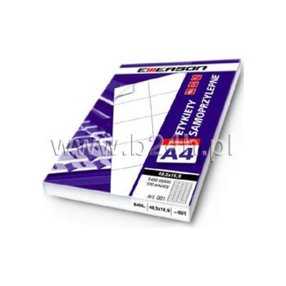 Οι αυτοκόλλητες ετικέτες παραδίδονται σε φύλλα Α4, λειτουργούν με όλους τους τύπους εκτυπωτών dot matrix και inkjet και με τους περισσότερους εκτυπωτές λέιζερ, η συσκευασία ετικετών περιέχει 100 φύλλα Α4{Type} Ορθογώνιες ετικέτες . {Χρώμα} Λευκό