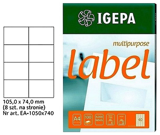 * jednostka sprzedaży: opak.100 * arkusze formatu A4 * możliwość zadruku w drukarkach laserowych, atramentowych i kserokopiarkach * papier jakości premium o wysokim poziomie bieli * klej permanentny, zapewniający trwałe przyleganie do powierzchni * opakowanie po 100 arkuszy typu „Wrap-around” umożliwia wielokrotne zamykanie, co wydłuża żywotność etykiet * bezpłatna aplikacja do przygotowywania etykiet - www.igepa.pl * etykiet na arkuszu 8 * etykiet w opakowaniu 800