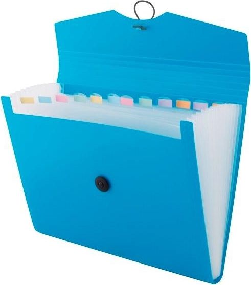 - teczka segregująca na dokumenty w formacie A4, zamykana na gumkę- wewnątrz posiada przegródki na dokumenty z wymiennymi etykietami do opisu zawartości- wykonana z mocnej folii PP- 12 przegródek