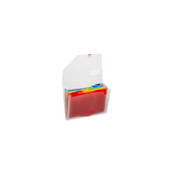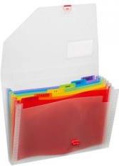 Φάκελος εγγράφων Α4 από πολύ συμπαγές και καλά κομμένο πολυπροπυλένιο. Παρέχει ευκολία κατά τη μεταφορά εγγράφων. Στο εσωτερικό υπάρχουν 6 πολύχρωμα διαχωριστικά με ευρετήριο. Έχει ένα μέρος για να τοποθετήσετε μια επαγγελματική κάρτα. Κλείσιμο με κούμπωμα Προδιαγραφές: - Μορφή A4 - Κλείσιμο με κούμπωμα - Ένθετο επαγγελματικής κάρτας - 6 φύλλα με ευρετήριο - μέγιστη χωρητικότητα 300 φύλλων χαρτιού.{Type} Με θήκες. {Μορφή} A4 . {Χρώμα} Διαφανές . {Υλικό} Πλαστικό . {Υλικό} Πολυπροπυλένιο