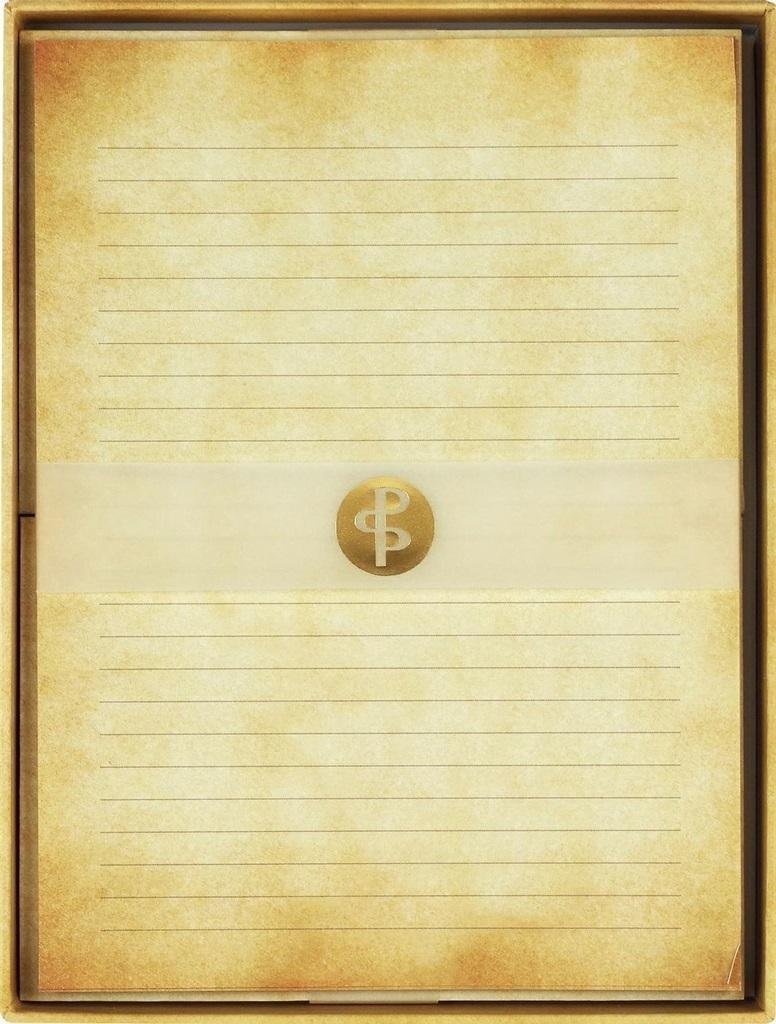 "Κλασικά χαρτικά από Peter Pauper Press - Vintage (Vintage Perchment). Σε ένα κομψό κουτί θα βρείτε 30 φύλλα χαρτιού με χρωματισμό διπλής όψης που μιμείται αρχειακό χαρτί, στη μία όψη επιπλέον τυπωμένα με γραμμές και 24 φακέλους ταιριαστούς χρώματος. Κάθε σελίδα , όταν διπλωθεί στη μέση, ταιριάζει τέλεια στους φακέλους.