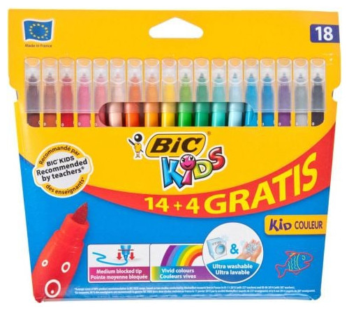 Klasyczne flamastryBiC Szeroka gama kolorów Tusz na bazie wody zmywalny ze skóry i spieralny z tkanin Wzmocniona końcówka o średniej grubości Blokada końcówki zapobiega wciśnięciu jej do wewnątrz Wentylowana skuwka Nietoksyczne Produkt bezpieczny dla dzieci