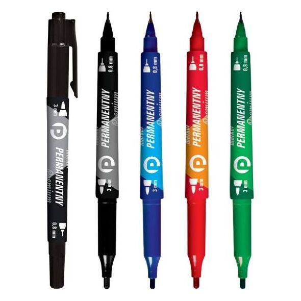 Μαρκαδόρος υψηλής ποιότητας σχεδιασμένος για γραφή στις περισσότερες επιφάνειες όπως: πλαστικό, γυαλί, μέταλλο, χαρτί, ξύλο, δέρμα, υφάσματα. Γεμισμένο με αδιάβροχο και γρήγορο στέγνωμα μελάνι με βάση το οινόπνευμα. Δεν περιέχει ξυλόλιο και τολουόλιο. Στρογγυλές μύτες: πάχος γραμμής γραφής 3 mm, άκρες ινών: πάχος γραμμής γραφής 0,8 mm Συσκευασία: κουτί 12 τεμαχίων. Χρώμα: μπλε.{Τύπος συμβουλής} Στρογγυλή. {Color} Σετ χρωμάτων . {Type} Μόνιμος δείκτης