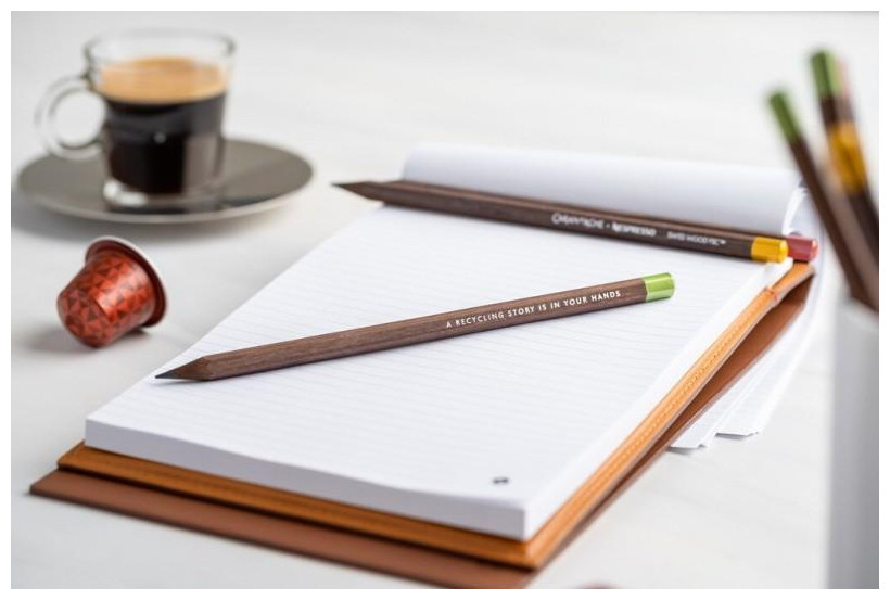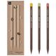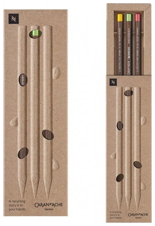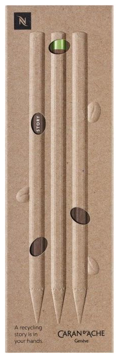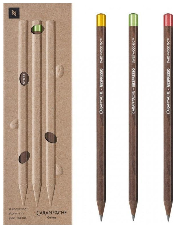 Zestaw trzech grafitowych ołówków Swiss Wood Twardość: porównywalna z miękkim HB Sześciokątny ołówek grafitowy Bezbarwny, matowy lakier na bazie wody ozdobiony 3 metalicznymi kolorami kapsułek: różowym, zielonym, złotym. Drewno bukowe z lasów kantonu Jura opatrzone etykietą Swiss Wood: charakterystyczny znak poświadczający, że drewno zostało wyhodowane w Szwajcarii w optymalnych warunkach oraz że zostało przetworzone w Szwajcarii przez wysoko wykwalifikowanych specjalistów. Drewno z certyfikatem FSC™ (Forest Stewardship Council). Wygrawerowany napis „A recycling story is in your hands”! [historia recyklingu jest w twoich rękach] Wkład grafitowy składający się w 25% z fusów kawy Przyjazne dla środowiska opakowanie wykonane w 100% z kartonu pochodzącego z i nadającego się do recyklingu. EAN: 7630002344678
