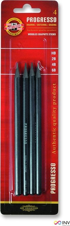 Ένα σετ 4 μαλακών μολυβιών Progresso χωρίς ξύλο εξ ολοκλήρου από καθαρό γραφίτη με σκληρότητες HB-2B-4B-6B._Είναι καλυμμένα με άχρωμο βερνίκι για να μην λερώνουν τα χέρια σας.{Αριθμός κομματιών στο σετ} 4 . {Type} Κανονικό . Σετ {Hardness}