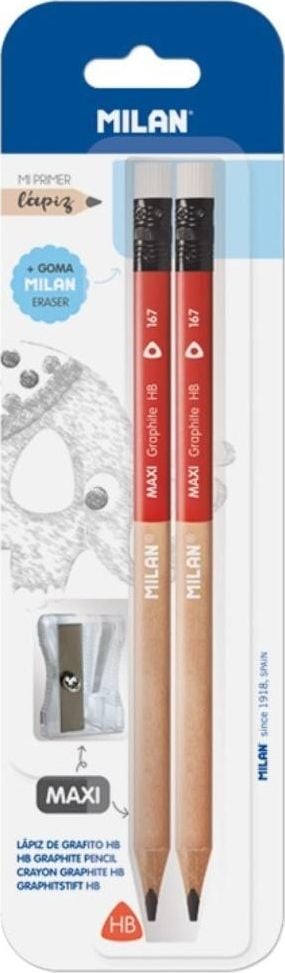 Το σετ περιλαμβάνει: 2 μολύβια και ξύστρα. 2 τριγωνικά μολύβια MAXI HB με μεγάλη γόμα. Ο γραφίτης HB είναι μέτριας σκληρότητας, καθιστώντας τον κατάλληλο για γραφή και σχέδιο, ιδανικό και για βιομηχανική χρήση. Διαθέτουν ένα μοναδικό Σύστημα Προστασίας Μόλυβδου (LPS), το οποίο αυξάνει την αντίσταση του γραφίτη στο σπάσιμο κολλώντας τον στο ξύλο. Το ξύλο προέρχεται από βιώσιμες φυτείες. Διάμετρος γραφίτη: 5 mm. Διαστάσεις μολυβιού: 19 x 1 cm. Πλαστικό ξύστρα χωρίς δοχείο για χοντρά μολύβια και κραγιόνια. Διαθέτουν αιχμηρές και ανθεκτικές λεπίδες από ανθρακούχο χάλυβα, καθιστώντας τις ιδανικές για όλους τους τύπους μολυβιών. Διαθέτουν σύστημα λεπίδας ασφαλείας που εμποδίζει την αποκόλληση της λεπίδας από το σώμα του ακονίσματος. Ιδανικό για σχολική χρήση. Μέγεθος blister: 25 x 7,2 x 1,5 cm.{Σκληρότητα} HB . {Αριθμός κομματιών στο σετ} 2 . {Type} Με λάστιχο