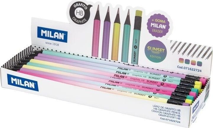 Μολύβια γραφίτη της σειράς Sunset HB, από μαύρο τίλιο και με έγχρωμη γόμα (κίτρινο, λιλά, ροζ και τιρκουάζ). Στρογγυλή διατομή, καλώδιο με διάμετρο 2,2 mm. Η κλίμακα HB είναι γραφίτης μέτριας σκληρότητας, συνιστάται για γραφή και σχέδιο. Ομοιόμορφη γραμμή γραφής και ανθεκτική στις ρωγμές. Περιέχει 6 κραγιόνια σε κάθε χρώμα (κίτρινο, λιλά, ροζ και τιρκουάζ).