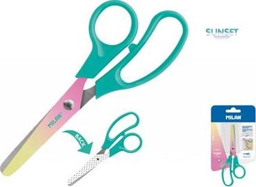 Σχολικό ψαλίδι BASIC SUNSET με χρωματιστή λάμα και πράσινη πλαστική λαβή. Μήκος 13,3 cm. Λεπίδα από ανοξείδωτο χάλυβα με στρογγυλεμένη μύτη. Ιδανικό για σχολική χρήση. Ένα πρωτότυπο προϊόν που δημιουργήθηκε από το τμήμα έρευνας και ανάπτυξης του MILAN. Μέγεθος ψαλιδιού: 13,3 x 5,3 x 1,1 cm.{Type}Γραφείο
