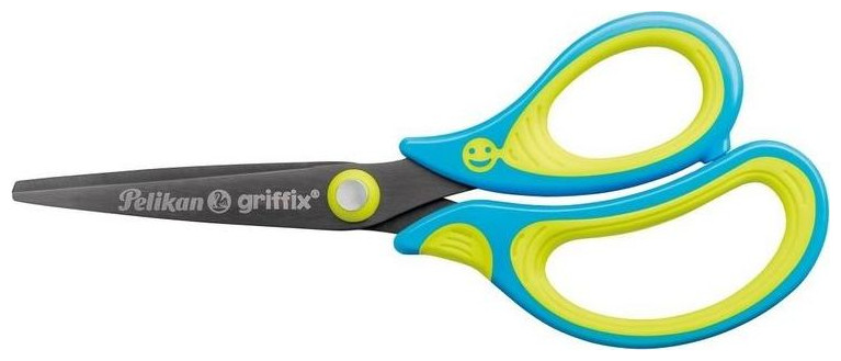 Nożyczki szkolne Griffix Pelikan wysokiej jakości nożyczki szkolne marki Pelikan z serii GriffixNożyczki Pelikan Griffix są niezbędnym elementem szkolnej wyprawki każdego dziecka, ponieważ ich używanie wspomaga rozwój motoryczny dzieci.Dzięki miękkiemu, ergonomiczne ukształtowanemu uchwytowi nożyczki Pelikan leżą wygodnie w dłoni i umożliwiają precyzyjne cięcie za pomocą ergonomicznych sposobów przytrzymywania nożyczek.Zaokrąglone ostrza są szczególnie odporne na zarysowania i wstrząs dzięki azotanowi tytanu.Na uchwycie nożyczki mają przydatne pole do podpisania nożyczek zapobiega ich zgubieniu, a uśmiechnięta buźka Griffix umożliwia dziecku sprawdzenie, czy trzyma nożyczki w prawidłowy sposób.W ten sposób wycinanie nawet dla najmłodszych okaże się dziecinnie proste!