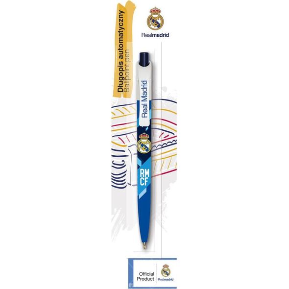 Długopis automatyczny z wymiennym wkładem, motyw Real Madryt. Grubość końcówki 0,7mm, długość linii pisania 800 metrów
