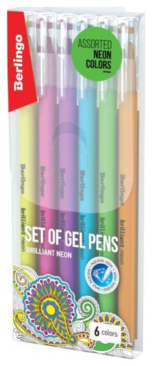 Ένα σετ στυλό τζελ Berlingo Brilliant Glitter σε 6 χρώματα νέον (κίτρινο, πράσινο, πορτοκαλί, ροζ, μπλε, μωβ). Η εργασία με αυτά τα στυλό αποτελεί εγγύηση για θεαματικά αποτελέσματα. Το υψηλής ποιότητας atramanet εξασφαλίζει ανθεκτικότητα στις γραμμές γραφής. Το βελούδινο περίβλημα από τη σειρά soft touch εξασφαλίζει άνεση κατά τη χρήση. Το χρώμα του βαρελιού κάθε στυλό αντιστοιχεί στο χρώμα του μελανιού. Τα στυλό είναι κατάλληλα για σχέδιο και γραφή σε μαύρο χαρτί. Διάμετρος μπάλας 0,8 mm, πάχος γραμμής γραφής 0,6 mm; Μήκος γραμμής γραφής: 450 m;