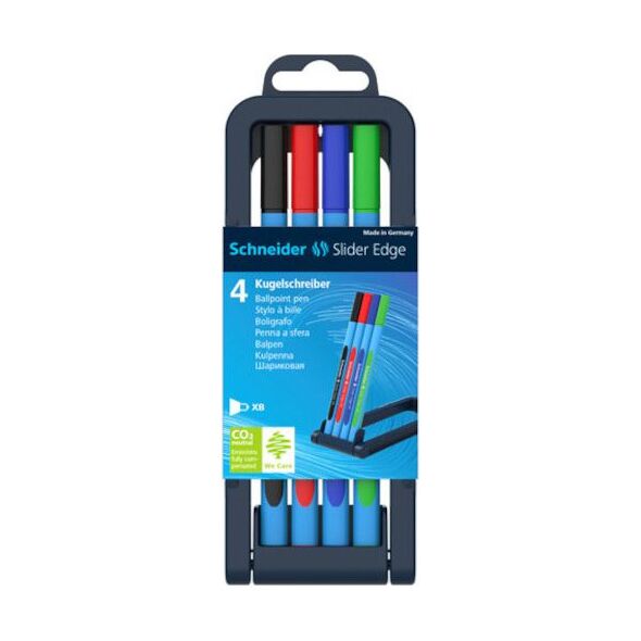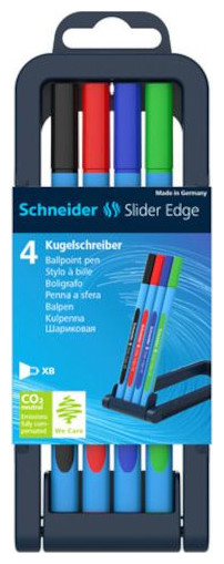 Schneider Slider Edge XB długopisy Zestaw zawiera cztery długopisy w kolorach: czarnym, czerwonym, niebieskim i zielonym. Długopisy posiadają gumowy, trójkątny trzonek, który zapobiega ich staczaniu się z biurka. Nie rozmazują się, nawet w połączeniu z markerami tekstowymi. Kołpak można obracać. Ponadto, mają smukły kształt, dzięki czemu idealnie pasują do szuflady lub etui na długopisy. Długopisy są dostarczane w kompaktowym czarnym etui z uchwytem na długopis. Długopisy można wyjąć z uchwytu na kliknięcie, dzięki czemu można je łatwo wyjąć. Idealny, gdy trzeba szybko przełączać się między różnymi kolorami! Specyfikacja: Kolor długopisu: czarny, czerwony, niebieski i zielony Kolor piórnika: czarny Płeć: unisex Materiał: tworzywo sztuczne, guma Grubość pióra: XB Spis treści 1 etui na długopisy 1 uchwyt na długopis 4 długopisy