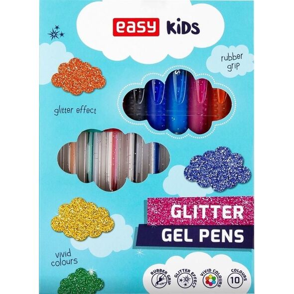 Τα στυλό τζελ EASY Kids Glitter με σωματίδια γκλίτερ επιτρέπουν τη μοναδική διακόσμηση καρτών, άλμπουμ και καλλιτεχνικών έργων από παιδιά, εφήβους και ενήλικες. Το υψηλής ποιότητας ένθετο gel και η εργονομική, λαστιχένια λαβή εξασφαλίζουν ανθεκτικότητα και άνεση στη χρήση. Τα στυλό γκλίτερ είναι ένα από τα πιο δημοφιλή προϊόντα EASY Kids Παράμετροι: - συσκευασία: σετ 10 τεμαχίων{Type} Αυτόματο . {Αριθμός τεμαχίων στη συσκευασία} 10 . {Insert color} Αναμίξτε