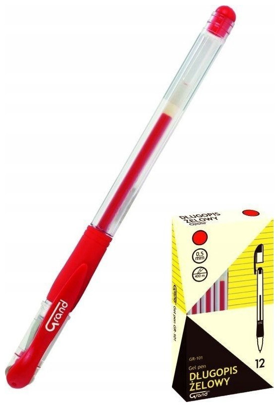 ΜΠΑΛΛΟΣΤΥΛΟ GEL GR-101, ΚΟΚΚΙΝΟ * με αντικαταστάσιμο γέμισμα * εργονομικό περίβλημα με αντιολισθητική λαβή * διαφανές περίβλημα επιτρέπει τον έλεγχο του βαθμού κατανάλωσης αναπλήρωσης * καπάκι στο χρώμα του ανταλλακτικού * μήκος γραφής: 400 m * πάχος γραμμής 0,5 mm * χρώματα μελανιού: μαύρο, κόκκινο, μπλε, πράσινοΧρώμα: Κόκκινο Σύμβολο προμηθευτή: 160-1026 Παραγωγός: Grand