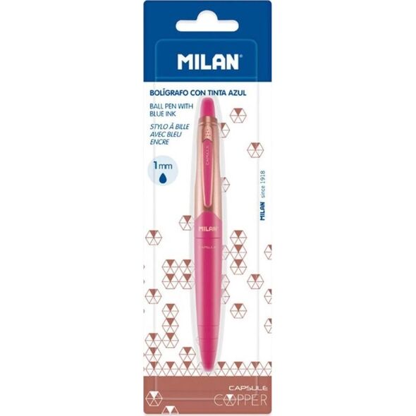 Στυλό CAPSULE COPPER με μπλε μελάνι. Ροζ και χάλκινο περίβλημα που παραπέμπει στη συλλογή COPPER. Έσπασε. Μήκος γραφής κατά προσέγγιση: 1000 μέτρα. Μύτη 1 mm. Μελάνι κατασκευασμένο στη Γερμανία. Ένα πρωτότυπο προϊόν που δημιουργήθηκε από το τμήμα έρευνας και ανάπτυξης του MILAN. Μέγεθος στυλό: 13,4 x 1,6 1 cm.{Εισαγωγή χρώματος} Μπλε . {Type} Αυτόματο