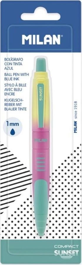 COMPACT μπλε στυλό από τη συλλογή SUNSET με περίβλημα στο χρώμα του ουράνιου τόξου. Έσπασε. Μήκος γραφής κατά προσέγγιση: 1000 μέτρα. Μύτη 1 mm. Μελάνι κατασκευασμένο στη Γερμανία. Ένα πρωτότυπο προϊόν που δημιουργήθηκε από το τμήμα έρευνας και ανάπτυξης του MILAN. 4 διαφορετικά χρώματα περιβλήματος: κίτρινο, μωβ, ροζ και τιρκουάζ. Μέγεθος στυλό: 14,1 x 1,7 cm x 1,4 cm.{Εισαγωγή χρώματος} Μπλε . {Type} Αυτόματο