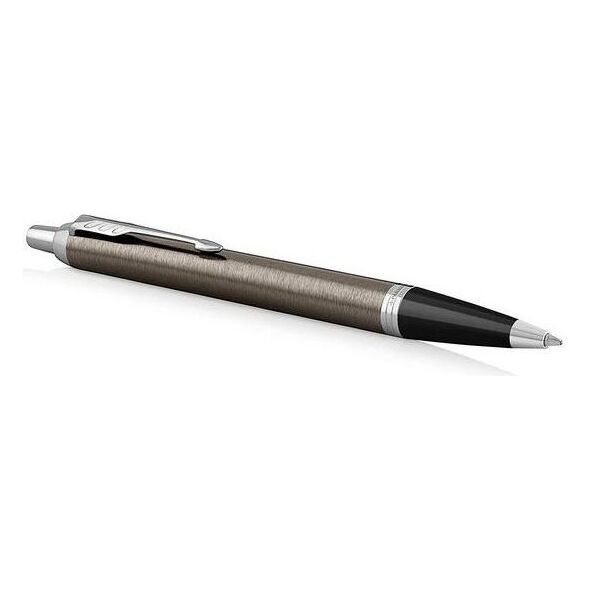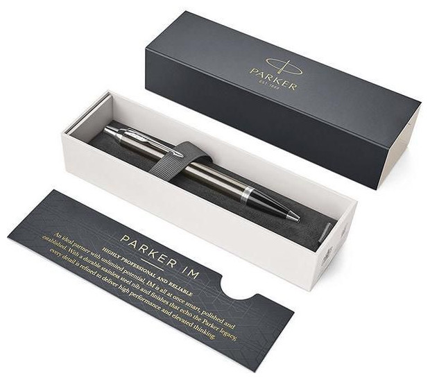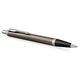 Η νέα συλλογή Parker IM 2016 είναι ένας φόρος τιμής στην παράδοση και ταυτόχρονα ένα νεύμα στις προσδοκίες του σύγχρονου ανθρώπου. Πρώτα απ 'όλα, η μαύρη, εργονομική λαβή, όπως στα ιστορικά μοντέλα της μάρκας. Στο κλιπ αναγράφεται καθαρά "φτερά βέλους". Λεπτό σχήμα. Το σώμα είναι κατασκευασμένο από σπειροειδώς βουρτσισμένο μέταλλο επικαλυμμένο με σκούρο βερνίκι espresso, εμπλουτισμένο με τριπλό δακτύλιο, το μεσαίο στοιχείο του οποίου έχει το λογότυπο Parker. Το Chrome τελειώνει. Μηχανισμός απελευθέρωσης φυσιγγίου με κουμπί.