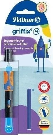 Στυλό Griffix Δύο εκδόσεις: για δεξιόχειρες και αριστερόχειρες. Μύτη από ανοξείδωτο χάλυβα ανθεκτική στην πίεση. Το μεγάλο παράθυρο μελανιού στο περίβλημα του στυλογράφου εξασφαλίζει βέλτιστο έλεγχο της στάθμης του μελανιού Διαθέτει ειδική ζώνη λαβής, χάρη στην οποία το παιδί κρατά το όργανο γραφής με τον σωστό τρόπο, το λεγόμενο. «λαβή τσιμπίδας». Στη συνέχεια, το στυλό κρατιέται με τρία δάχτυλα: τον αντίχειρα, τον δείκτη και το υποστηριζόμενο μεσαίο δάχτυλο. Μόνο αυτή η λαβή εγγυάται την εύκολη και σωστή γραφή το στυλό στο χέρι.{Insert color} Μαύρο. Στυλό {Type}