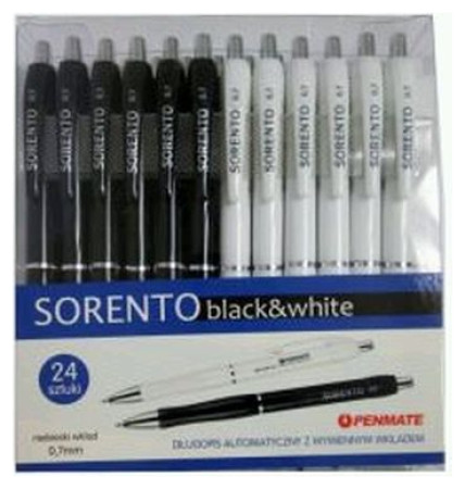 Αναδιπλούμενο στυλό με αντικαταστάσιμο γέμισμα, μελάνι χαμηλής βισκόζης, μπίλια, λαστιχένια ένθετα στη λαβή, λευκό και μαύρο περίβλημα.