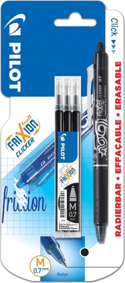 Μαύρο στυλό FriXion Clicker σε blister, με μέγεθος μύτης γραφής 0,7, με 3 επιπλέον ανταλλακτικά. Γράψε ομαλά με φαρδιά μύτη, σβήσε με τη γόμα σιλικόνης FriXion και ξαναξεκίνα! Το μπεστ σέλερ του Pilot σάς επιτρέπει να γράφετε καθαρά και να αφαιρείτε το μελάνι τρίβοντας - όλα με το ίδιο στυλό. Το μοναδικό μελάνι gel αντιδρά στη θερμότητα που παράγεται από το τρίψιμο και σας επιτρέπει να διορθώσετε το λάθος σας αμέσως!{Εισαγωγή χρώματος} Μπλε . Στυλό {Type}