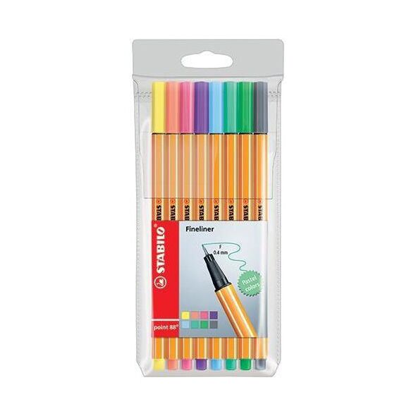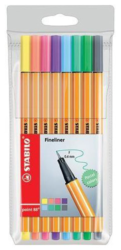 Το αδιαμφισβήτητο Νο. 1 μεταξύ των fineliners από το 1977. 4 points 88 fineliners πωλούνται στην Ευρώπη κάθε δευτερόλεπτο. Universal fineliner για γραφή, επισήμανση, σχέδιο και χρωματισμό. Η ισχυρή μύτη με μεταλλικό σκελετό είναι ανθεκτική στο σπάσιμο και στην αποκόλληση, γεγονός που εγγυάται υψηλή άνεση γραφής μέχρι να εξαντληθεί τελείως το μελάνι. Πάχος γραμμής 0,4 mm. Το αεριζόμενο καπάκι επιτρέπει την αναπνοή σε περίπτωση ξαφνικής κατάποσης. Το μόνο λεπτόρρευστο διαθέσιμο σε 47 χρώματα. Πλαστική θήκη με κρεμάστρα που περιέχει 8 τεμάχια σε παστέλ χρώματα αλουμινόχαρτο, 8,5x19x1 cm{Χρώμα φυσιγγίου} Πράσινο . {Εισαγωγή χρώματος} Μπλε . {Insert color} Ροζ . {Insert color} Μωβ. {Type} Fineliner . {Χρώμα φυσιγγίου} Κίτρινο . {Insert color} Γκρι . {Insert color} Coral. {Replaceable cartridge} Αρ. {Insert color} Αναμίξτε . {Αριθμός τεμαχίων στη συσκευασία} 8