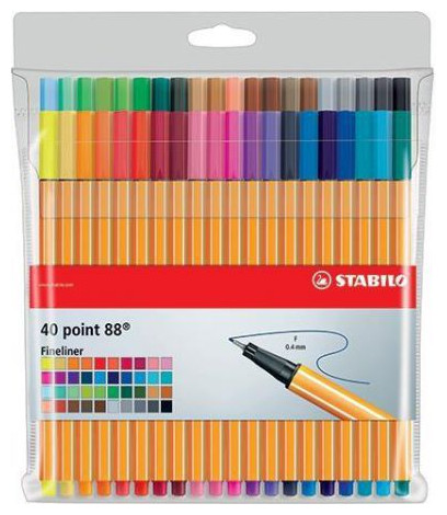 Το αδιαμφισβήτητο Νο. 1 μεταξύ των λεπτών γραμμών από το 1977. Τέσσερα σημεία 88 πωλούνται στην Ευρώπη κάθε δευτερόλεπτο. Η ισχυρή μύτη με μεταλλικό σκελετό είναι ανθεκτική στο σπάσιμο και στην αποκόλληση, γεγονός που εγγυάται υψηλή άνεση γραφής μέχρι να εξαντληθεί τελείως το μελάνι. Πάχος γραμμής 0,4 mm. Το αεριζόμενο καπάκι επιτρέπει την αναπνοή σε περίπτωση ξαφνικής κατάποσης. Το μόνο λεπτόρρευστο διαθέσιμο σε 47 χρώματα. Πλαστική θήκη με κρεμάστρα που περιέχει 40 χρώματα{Type} Fineliner . {Replaceable cartridge} Αρ. {Insert color} Αναμίξτε . {Αριθμός τεμαχίων στη συσκευασία} 40
