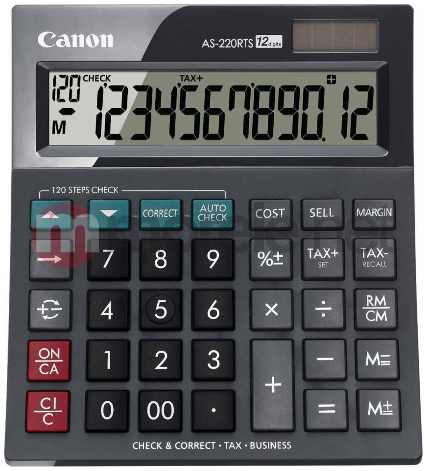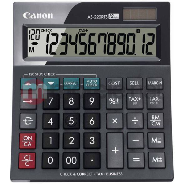 Υπολογιστής Canon AS-220RTS, γκρι, επιφάνεια εργασίας, 12 θέσεων{Κατασκευή} Πλαστικό. {Κατασκευή} Περιγραμμένη οθόνη. {Amount of memory} 1 μνήμη . {Αυτόματη επανάληψη} Ναι . {Στρογγυλοποίηση} Αρ. {Additional features} Έλεγχος υπολογισμού και λειτουργία διόρθωσης. {Ενσωματωμένος εκτυπωτής} Αρ. {Τύπος τροφοδοσίας} Μπαταρία-ηλιακός. {TAX function} Ναι. {Other} Λειτουργία αναίρεσης . {Τύπος εμφάνισης} 12 ψηφία. {κλειδί μηδέν} 00 . {Πρόσθετες λειτουργίες} Υπολογισμός περιθωρίου. {Τύπος οθόνης} LCD . {Other} Υπολογισμοί ποσοστού . {Χρώμα}Σκούρο γκρι . {History} Μνήμη 120 βημάτων. {Πλάτος [cm]} 13,4 . {Βάθος [cm]} 15 . {Ύψος [cm]} 3,6 . {Other} Επιχειρηματικές λειτουργίες . {Βάρος [g]} 150 . {Other} Αλλαγή σήματος +/-