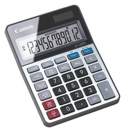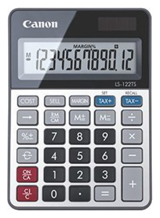 Canon LS-122TS. Układ: Komputer stacjonarny, Model: Wyświetlacz kalkulatora. Cyfry: 12 cyfr(y). Kalkulacja podatku, Kalkulacja zysku. Źródło zasilania: Bateria/Energia słoneczna. Kolor produktu: Szary