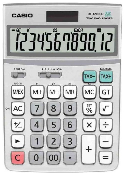 Duży kalkulator biurowy serii (ECO - produkowany z materiałów z recyklingu)Obliczenia podatkowe TAXPamięćKlawisz cofania ostatniej cyfryZnak +/-Wskaźnik wykonywanego działaniaProcenty (MLP)Konwersja 4 walutZaokrąglanie liczbZaokrąglanie w dółPrzybliżenia do: 4, 3, 2, 1, 0 miejsc po przecinkuZapis walutowyPierwiastek kwadratowyZnacznik części tysięcznejObliczenia ze stałąSuma całkowita (GT)Wyświetlacz: 12 cyfrDuży wyświetlaczKey RolloverPodwójne zasilanie (bateria słoneczna + LR44)Wymiary: 175,5 x 122,5 x 35,7 mmWaga: 180 gObudowa: metal, plastikDodatkowa podpórka pod kalkulatorem