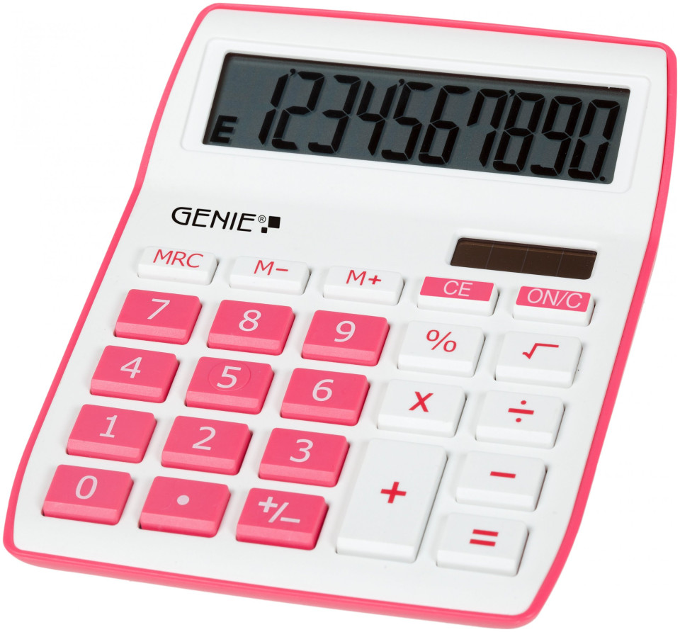 Genie 840 P. Διάταξη: Επιφάνεια εργασίας, Μοντέλο: Οθόνη αριθμομηχανής. Ψηφία: 10 ψηφία, Αριθμός γραμμών κειμένου: 1 γραμμή, Ανακλινόμενη οθόνη. Πηγή ενέργειας: Μπαταρία/Ηλιακή ενέργεια. Χρώμα προϊόντος: Ροζ, Λευκό